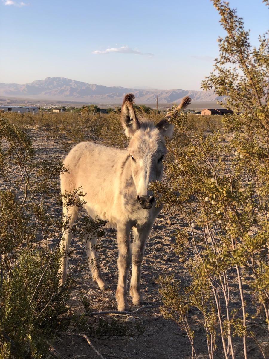 The way to Winky’s heart was shown to us by our oldest donkey Pete, who spent an afternoon eating the seed pods that had fallen from a Mesquite tree. Researching to find out that these pods are a staple for donkeys, especially in Death Valley, we decided to offer them to the rest of the herd. Every donkey immediately recognized the smell of the pods and came up to get their share. So did Winky! We threw a few on the ground for him and he ate them up. From there, Winky quickly learned to eat out of our hands. Without treats, he continues building his trust with us, following behind the humans like a shy puppy, allowing a few gentle pets before he moves away.